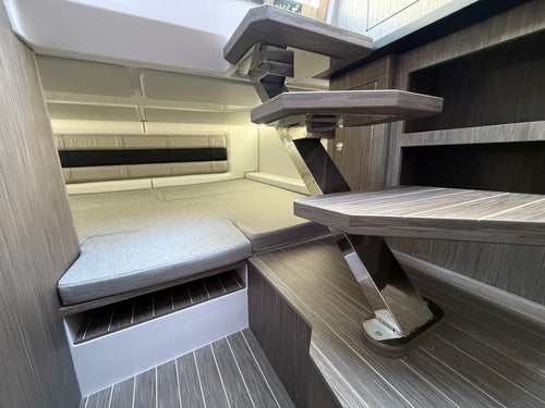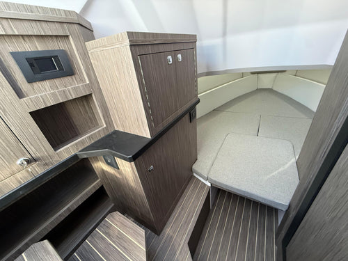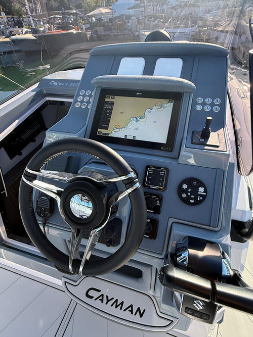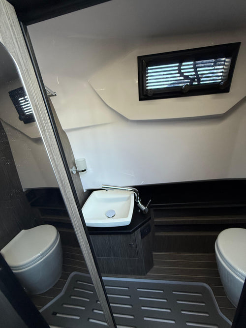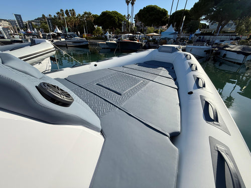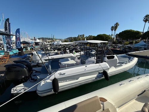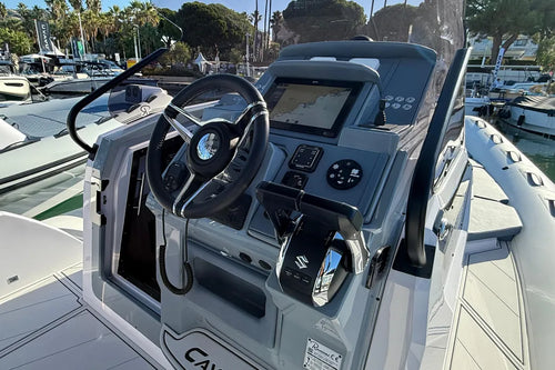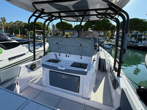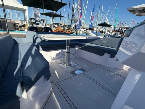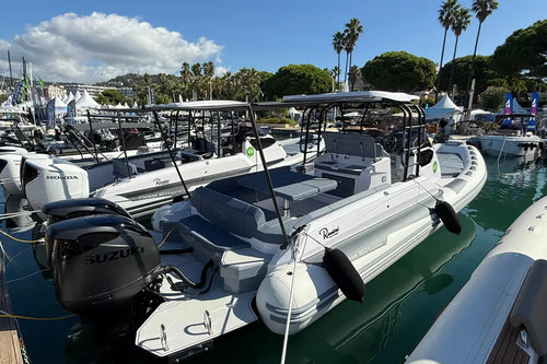 Ce navire de démonstration est neuf (non immatriculé), il a été motorisé avec un TWIN SUZUKI 2 x 350 cv MAT de dernière génération afin de valoriser sa présentation et ses qualités marines lors du salon de Cannes 2025.